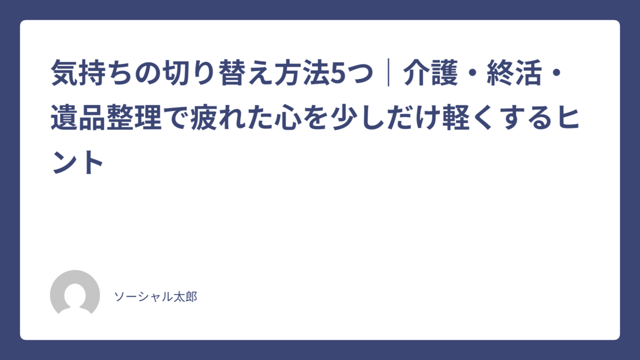 社会福祉士としてご家族の支援に携わる中で、「切り替えられない自分がダメなんだ」と自分を責めている方に何度も出会ってきました。でも、気持ちの切り替えは気合いや根性でできるものではありません。かといって、何もできないわけでもない。ほんの小さな工夫で、少しだけ心が軽くなることがあります。